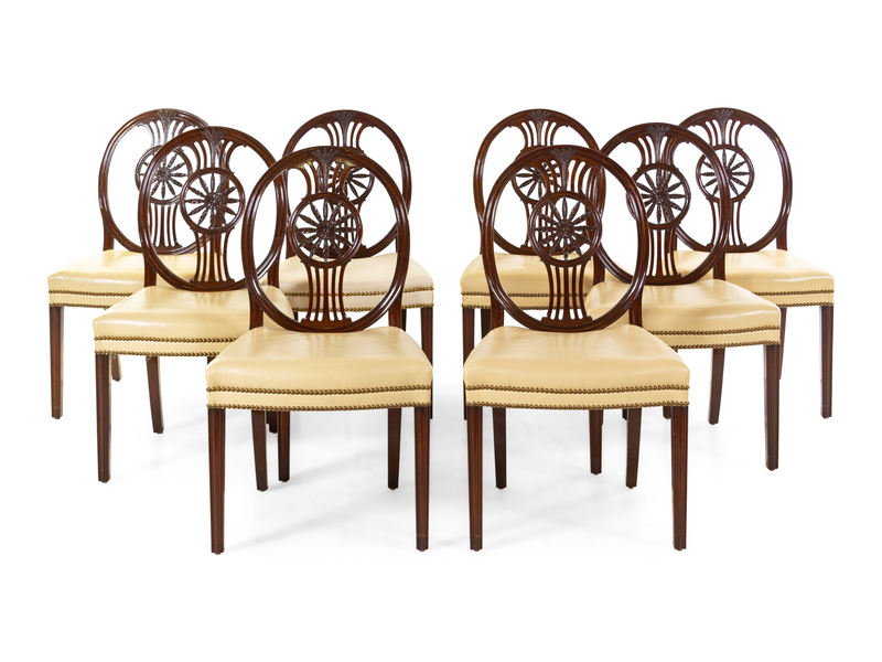A Set of Eight Regency Style Carved Mahogany Leather-Upholstered Dining Chairs