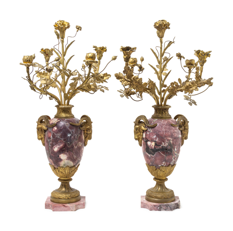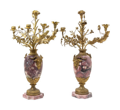 A Pair of Gilt Bronze Mounted Marble Five-Light Candelabra