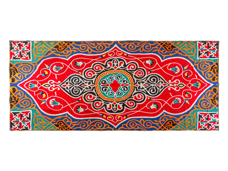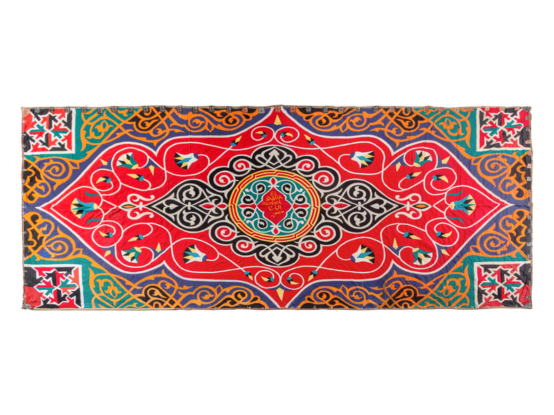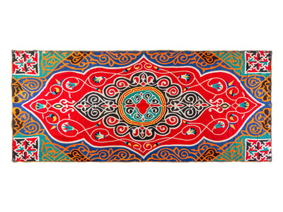 one example with arabesques and geometric decoration on a red ground, the other example with arabesques in various colors.