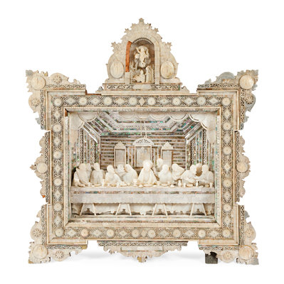 A Palestinian Carved Mother-of-Pearl and Abalone Last Supper Diorama