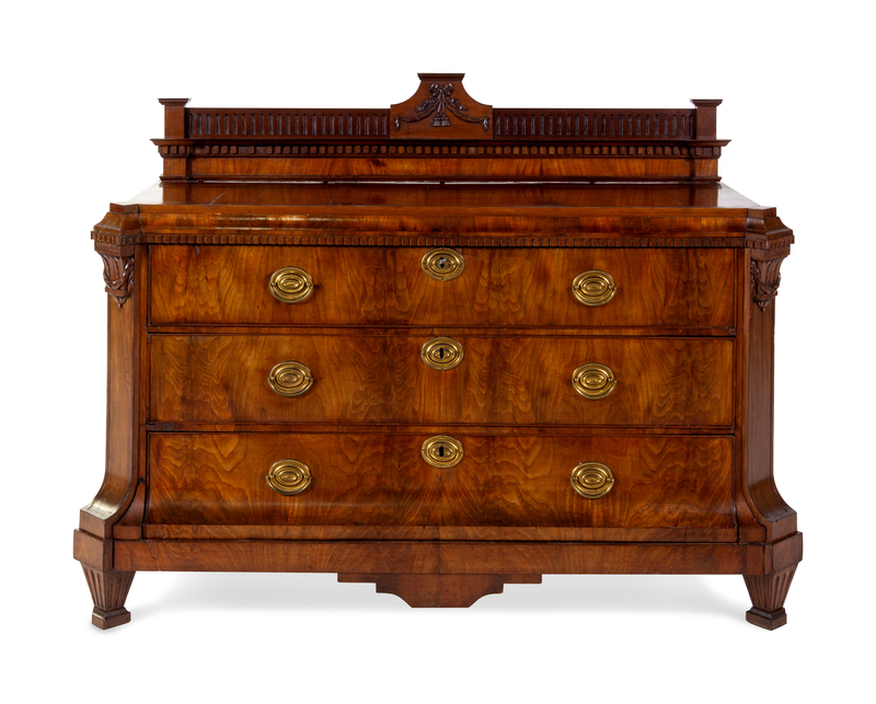 in the Louis XVI taste, the dentiled crest above three graduated drawers.