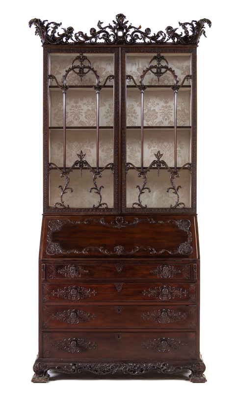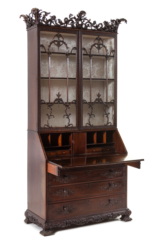 in the Chinese Chippendale taste, in three parts, the crest pierce carved with rocaille and foliate scrolls, the superstructure with blind-fretwork carved glazed doors having foliate, C-scroll and S-scroll astragals opening to three shelves, the base fitted with a fall-front opening to a writing surface and a central door flanked by six pigeon holes and four drawers, further over four graduated long drawers, the whole raised on foliate carved bracket feet.