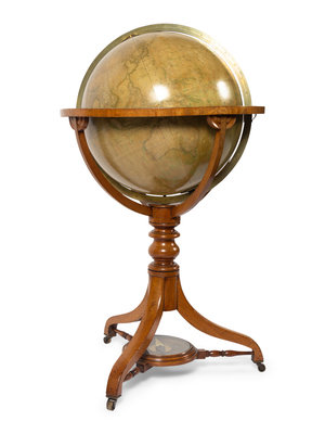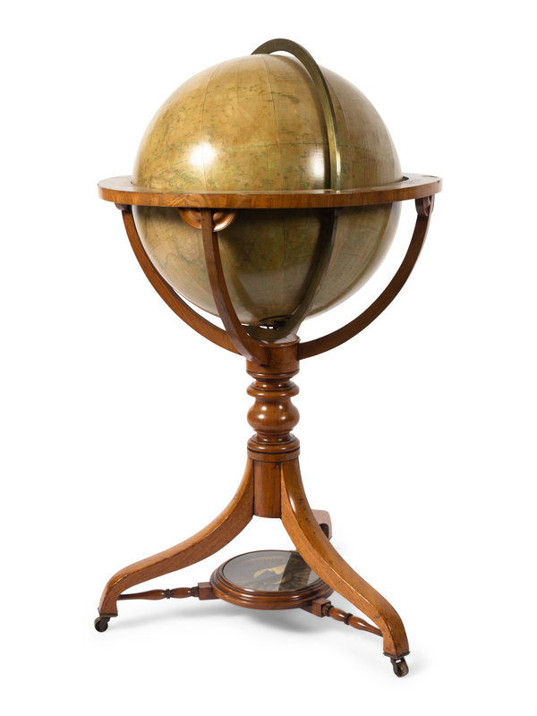 raised on mahogany stand, the legs joined by stretchers centered with a compass.