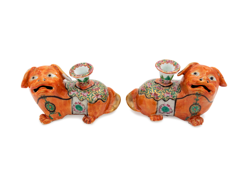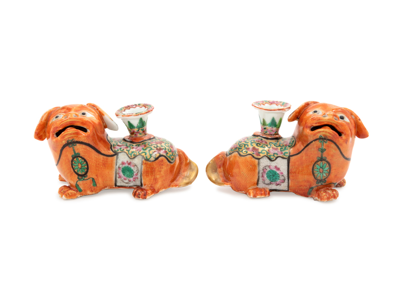 A Pair of Chinese Famille Rose Porcelain 'Foo Dog' Joss Stick Holders