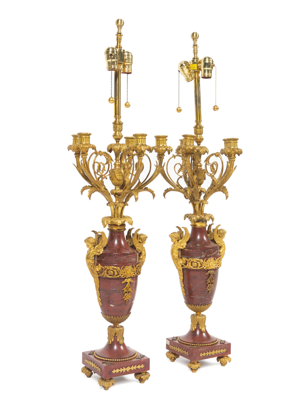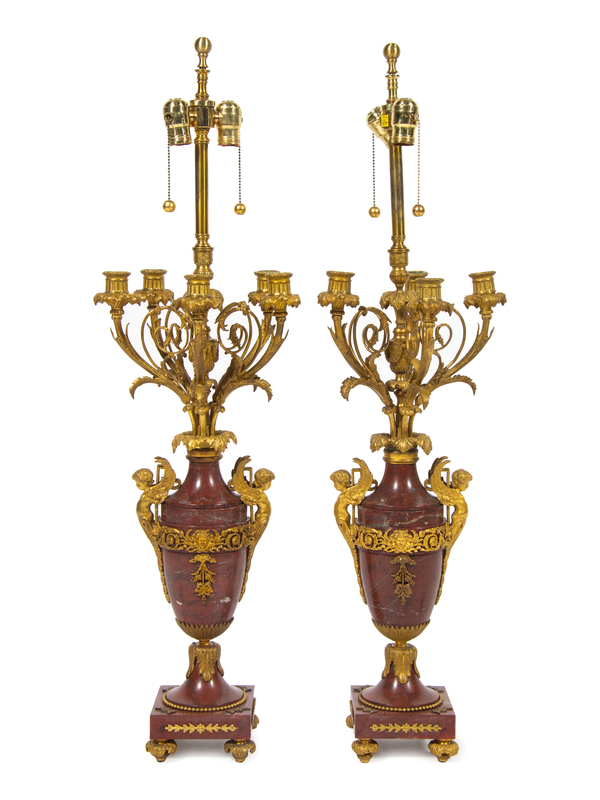 A Pair of Louis XV Style Gilt Bronze Mounted Marble Candelabra