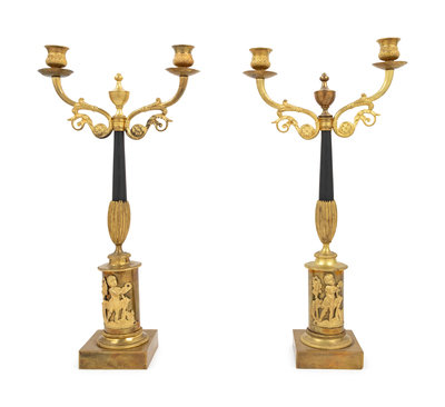 A Pair of Empire Style Gilt and Patinated Bronze Two-Light Candelabra