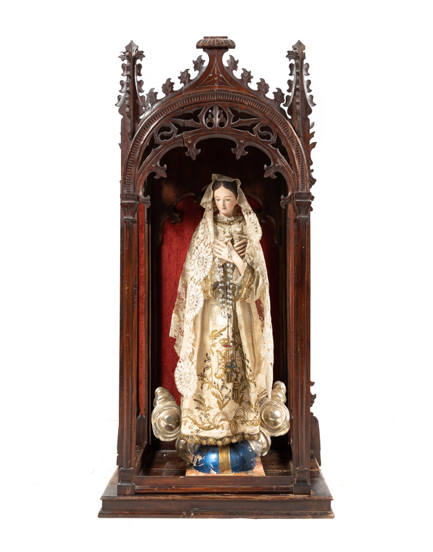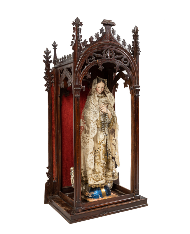 A Gothic Revival Mahogany Reliquary with a Continental Painted Figure of the Madonna