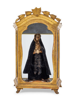 Height of reliquary 23 1/4 x width 14 3/4 inches; height of figure 14 1/2 inches.