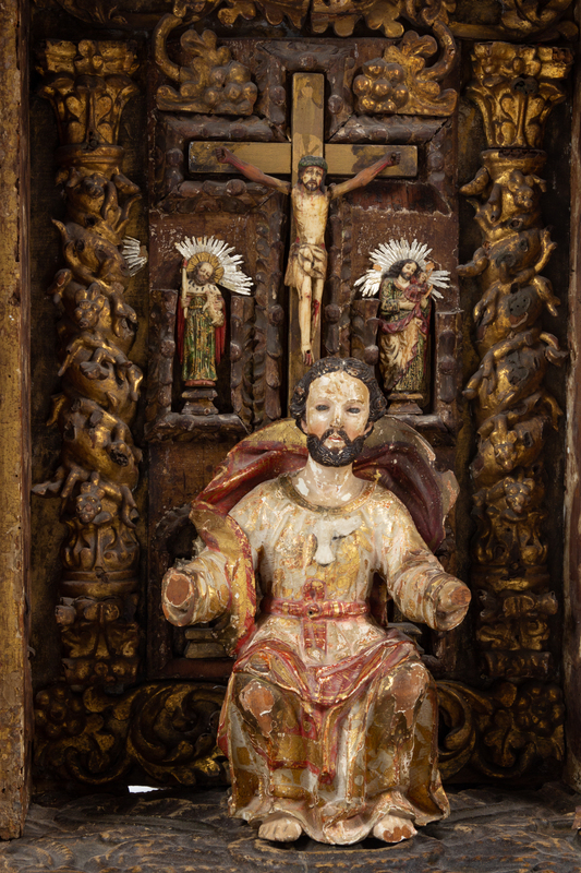 Height of reliquary 27 x width 16 inches; height of figure 11 inches.