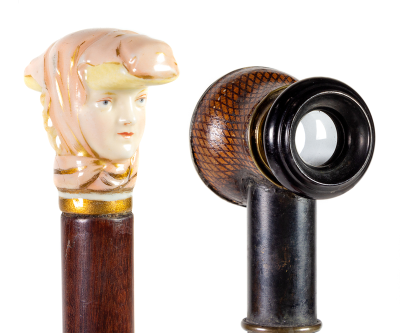 one example with a porcelain handle in the form of a lady's head, the other example having a handle mounted with a magnifying glass, each above a mahogany shaft ending in a cast metal ferrule.