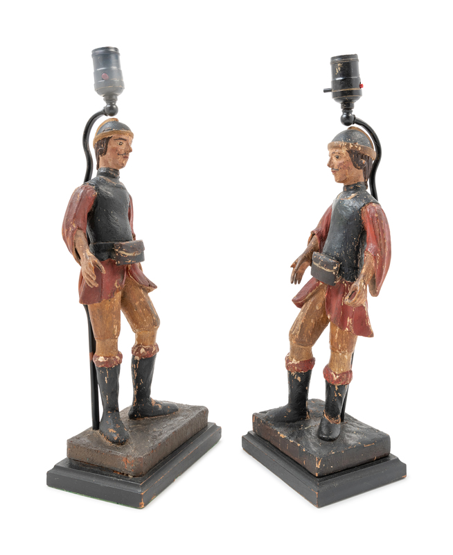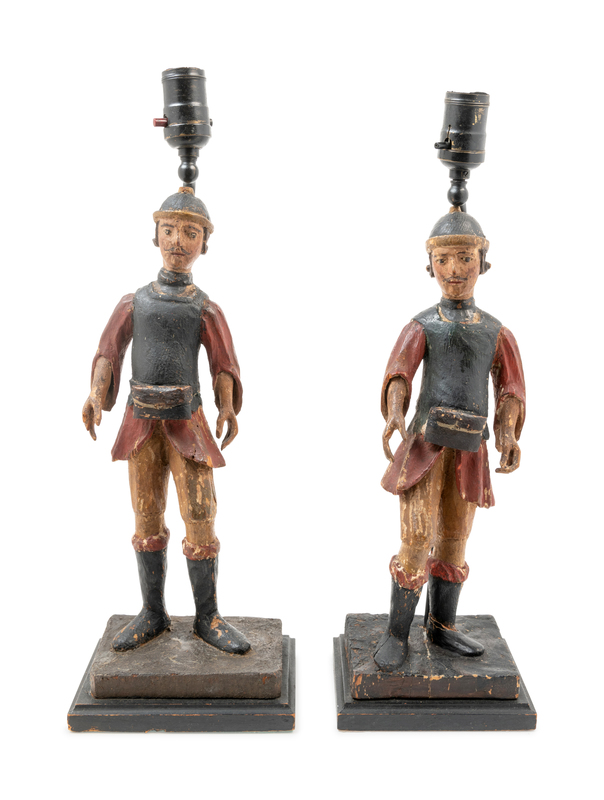 each carved as a standing man with helmet and boots, mounted as lamps.
