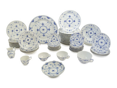 comprising a circular platter, 5 salad plates, 5 oversize cups with 3 saucers, 17 saucers in two sizes, 4 soup bowls in two sizes, 16 teacups in various sizes, a creamer, a teapot and several other serving articles.