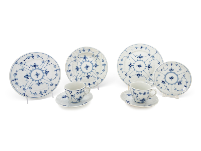 in the Full Lace pattern, comprising 8 luncheon plates, 8 salad plates, 8 salad bowl, 8 coffee cups, 9 saucers, 1 sauce boat, 2 saucers in the blue flower pattern; 44 items total.