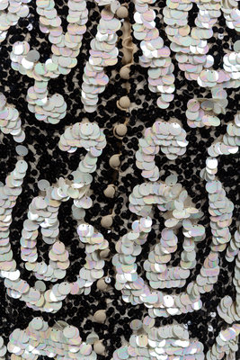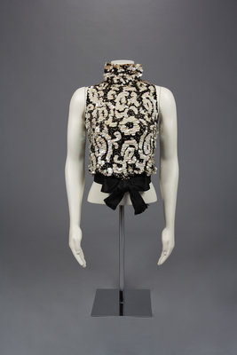 Black and pearl sequined sleeveless turtleneck blouse with nude underlining, black silk satin ribbon waist band with bow detail, and center back loop and button closure.