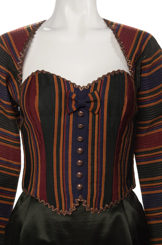 The First: Green, blue, maroon, copper stripe ensemble of quilted bolero, bustier, and green satin skirt.