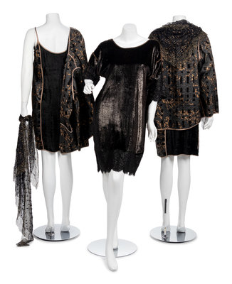 The Second: Black and gold panne velvet dress trimmed with gold braid and hemmed with black lace.
