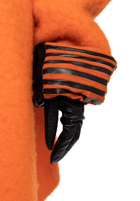The Third: An orange wool mohair coat with gathered back waistline and stand collar at back neck. Comes with black belt and orange and black leather gloves.