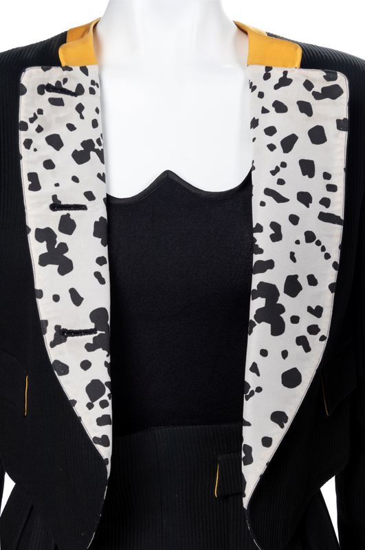 The First: Black three piece ensemble of jacket with yellow collar and white buttons, knit top, and pleated pants.