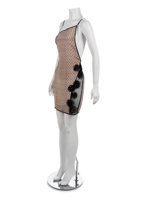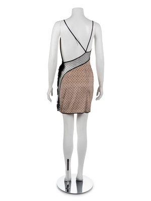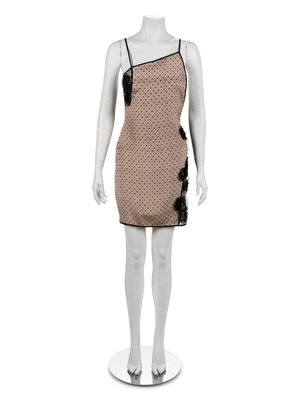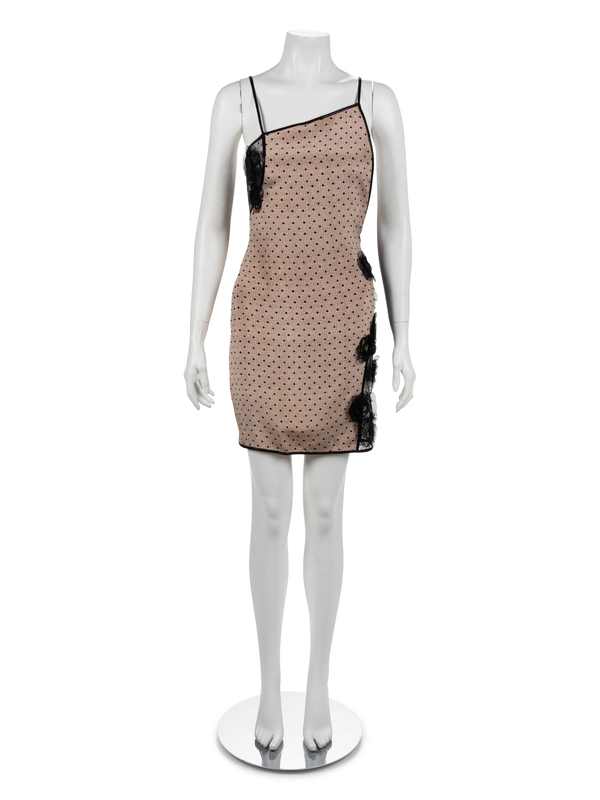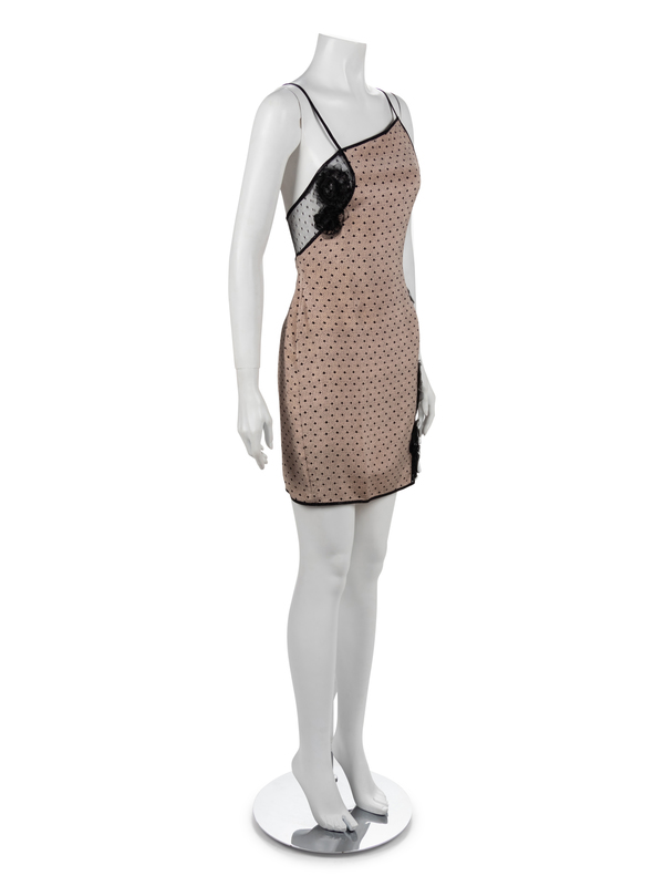 Slip minidress in beige silk printed in black with point d’esprit pattern and inset panel with black point d’esprit sewn with black organza ribbon flowers at R underarm, across back and down L hip to hem.