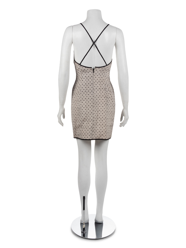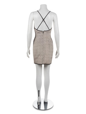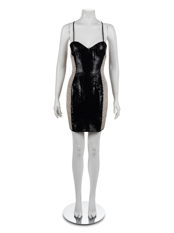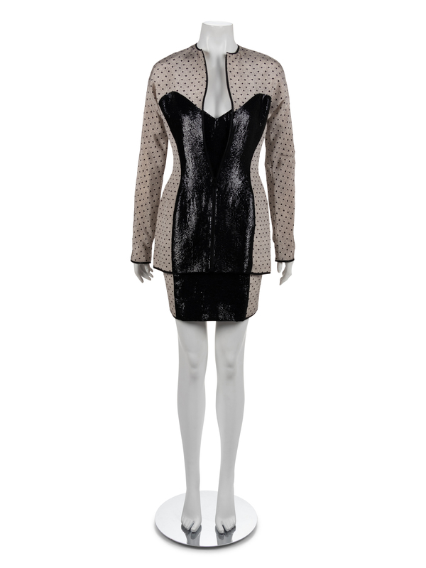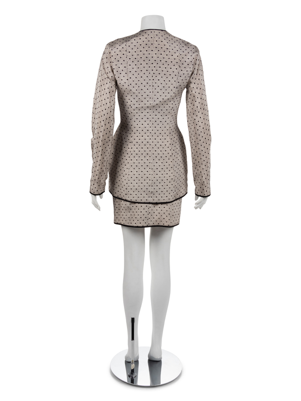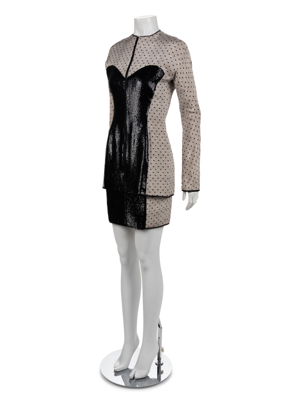 Two piece ensemble of cream silk printed with a lace pattern in black and with a front embroidered with black sequins.