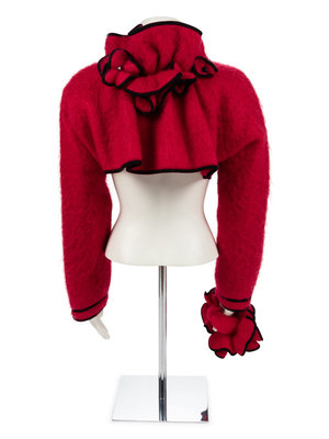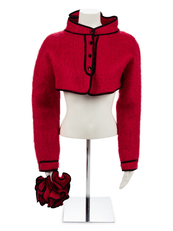 Red mohair short jacket with long sleeves, stand collar and trimmed with black braid. The center back neck is gathered and embellished with self-fabric flowers also trimmed with black braid. A separate piece of gathered material comes with this item and is described as a 'bouquet'.
