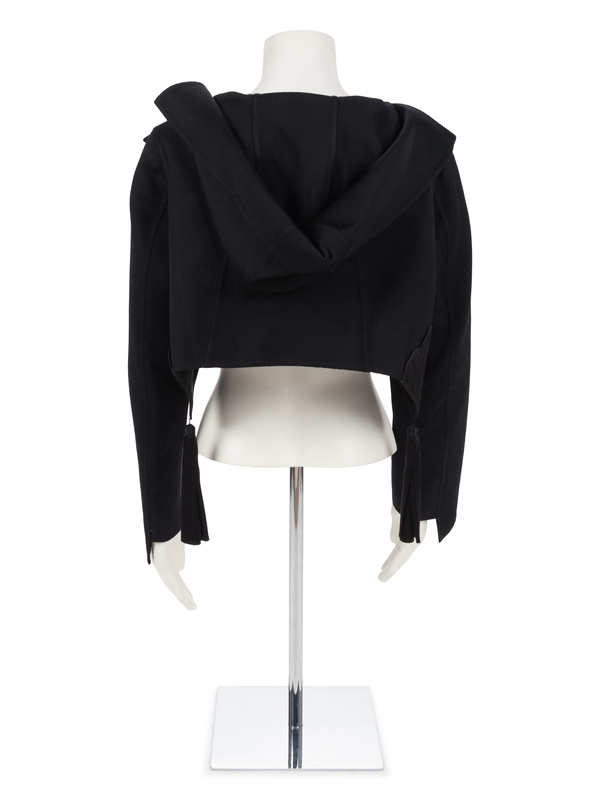 Black wool bolero with scalloped and cloth yassels with hood detail.