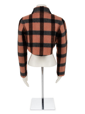 Grey, peach and brown mohair plaid bolero with decorative flaps over the chest, fold down collar and a single button at the neck.