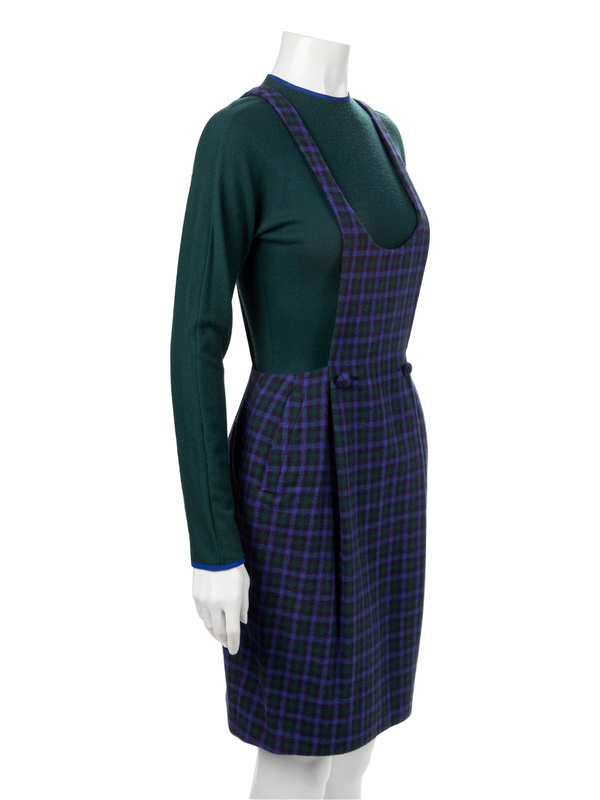 The First: Navy, cobalt, and dark green check wool ensemble with jacket, jumper, and green long sleeve knit top.