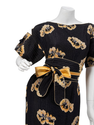 The First (Spring 1982): Long black silk dress with yellow flower print, metallic top quilted stitching and embroidered flowers at each sleeve hem.