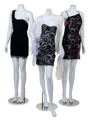 The Second: Black and white lace ensemble consisting of a short slip dress of black re-embroidered lace edged with white lace at neckline and back bodice and thin band black horsehair trim at hem. Worn with a white lace stole.