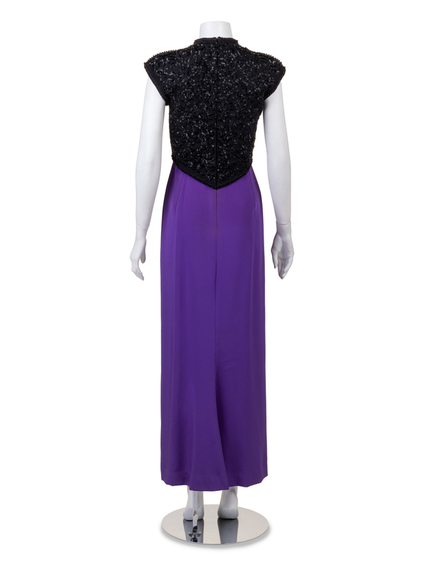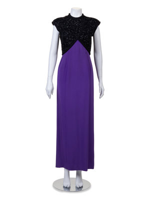 Long dress with a black bodice encrusted with black glass bead embroidery attached to a long straight purple skirt.