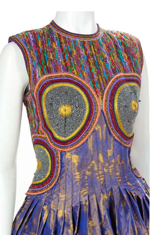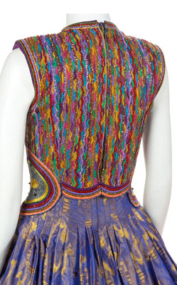 The First: Short evening dress with puff skirt of violet and gold moiré patterned iridescent damask and multi-color bodice embroidered with circles at bust and wavy stripes in beads and sequins of various