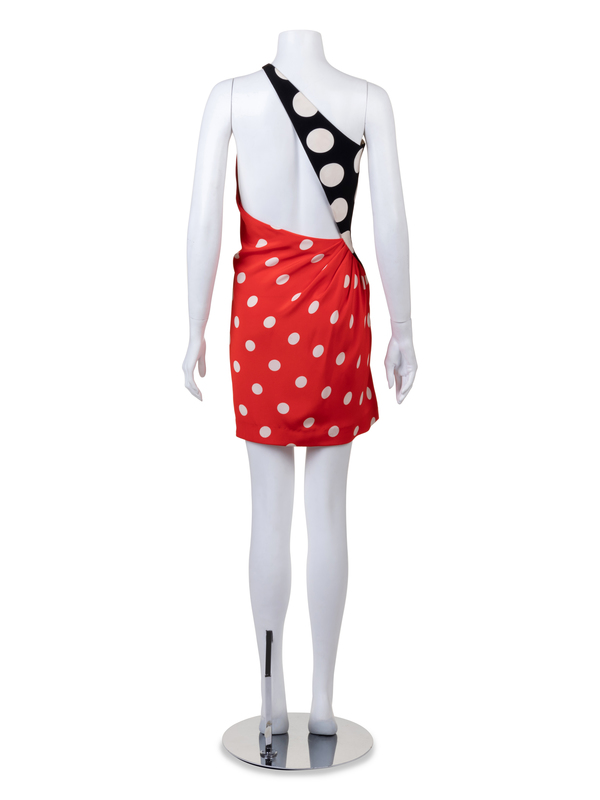 Red, black and white polka dot dress with assymetrical design and one shoulder.