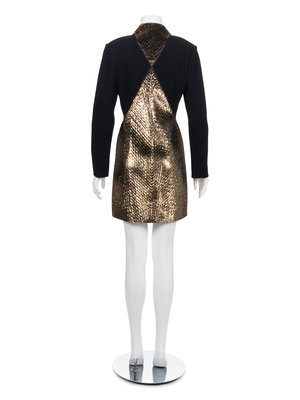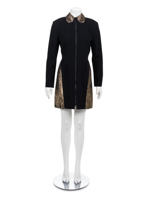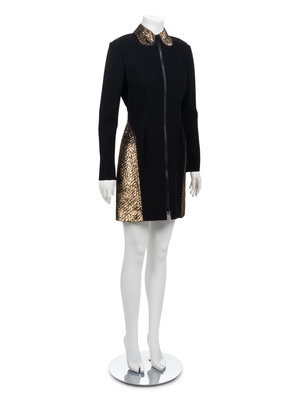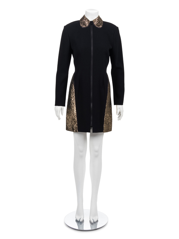 Short dinner dress of black wool with industrial zipper front, Peter Pan collar, side hip panels and point back panels of gold and black panne velvet sewn with diamond topstitching.