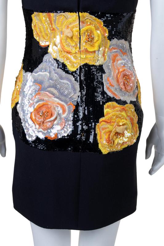 The Second: A 1989 black silk crepe strapless dress with orange, red, pink, yellow and white embroidered flowers from below bust to waist.