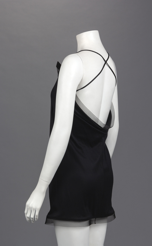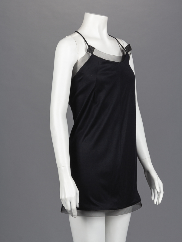 The Third: Black jersey mini dress edged with synthetic horsehair trim and spaghetti straps and matching bolero.