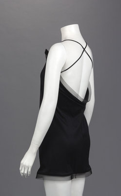 The First: Black wool jersey halter evening dress with black tulle and organza insets.