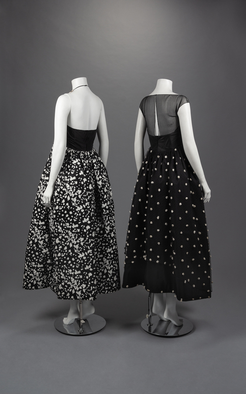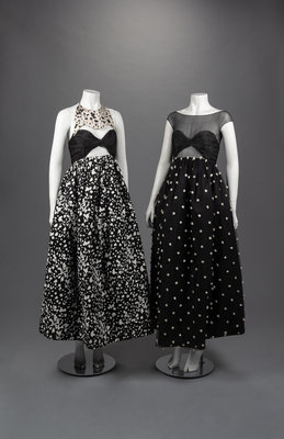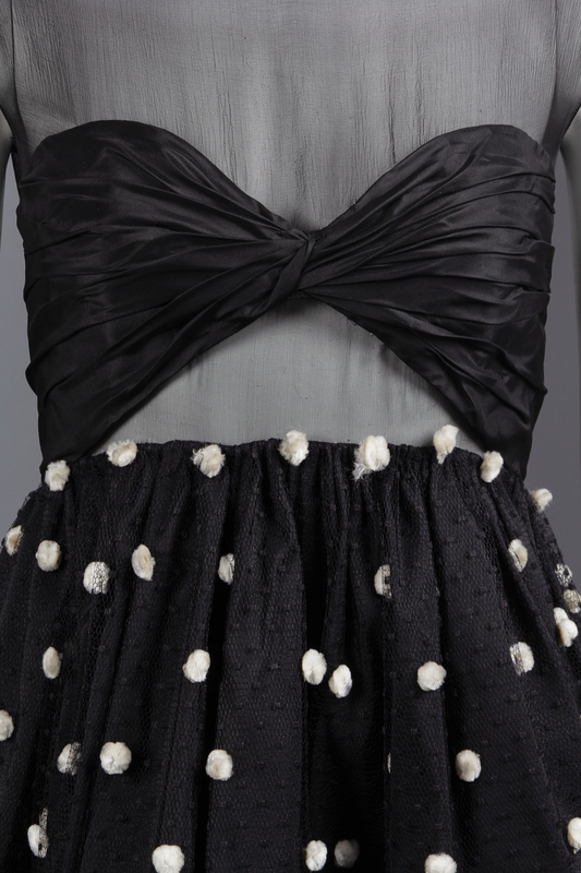 The Second: Black silk evening dress with sheer crepe neckline attached to black faille shirred bustier, full skirt of faille with overlay of black point d'esprit and white chenille pom-poms, and center back zipper closure.