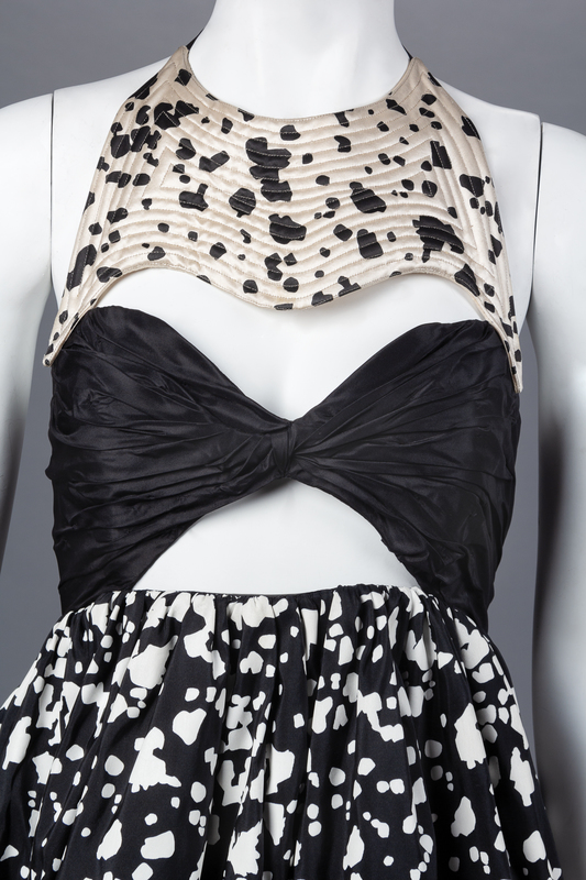 The First: Black and white silk satin and faille printed evening dress with quilted halter detail attached to shirred bustier, full skirt, and center back skirt zipper closure.