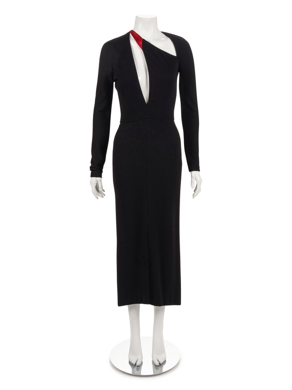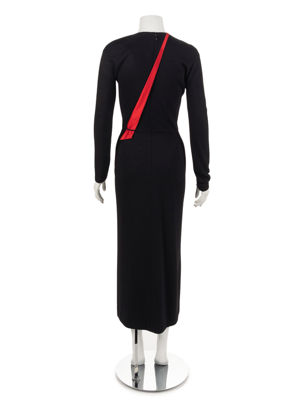 Black wool knit dress with long sleeves and a cut out design down the center front and around the neckline, which extends to the back with a tab of red satin that forms the closure by tucking into the back left side.
