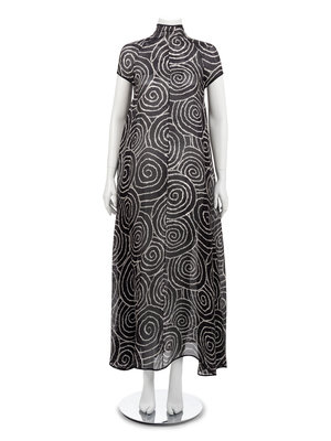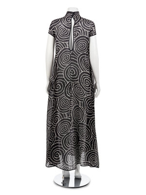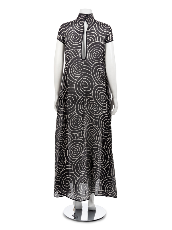 Long a-line evening dress of black silk gazar with white spiral print, cap sleeves, funnel neck and large keyhole opening at center back.