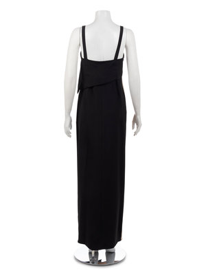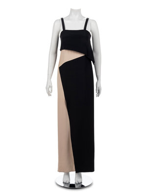 Long column dress in beige and black silk crepe creating a vertical zigzag effect on front only with a back in solid black, narrow shoulder straps, black silk asymmetric overlay starting at top of neckline and ending at below the bust.