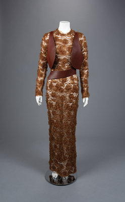 Brown re-embroidered lace long sleeve dress with center back zipper closure, leather vest with matching leather tie belt.