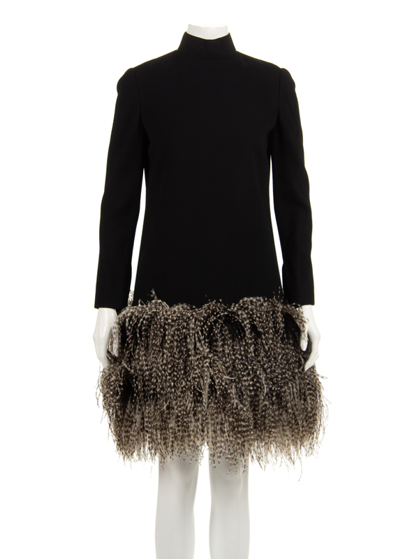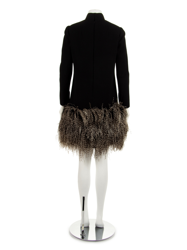 Black wool crepe dress with speckled ostrich feather hem. Stand collar, long sleeves and a center back zip.