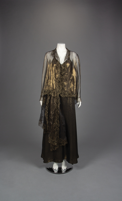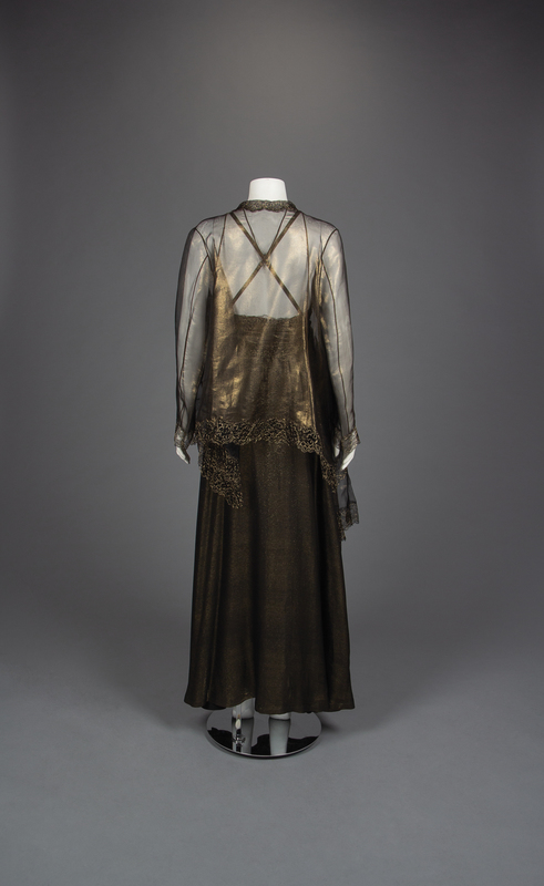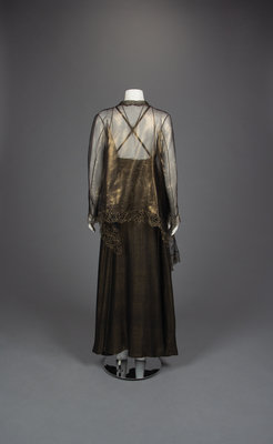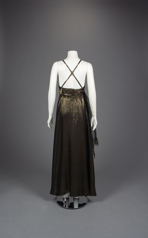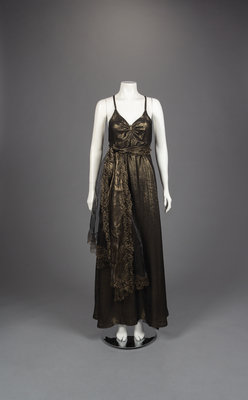 Black and gold lurex/silk blend cross back slip dress with gathered bust, belt, and gold silk organza cardigan jacket with reembroidered lace.