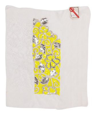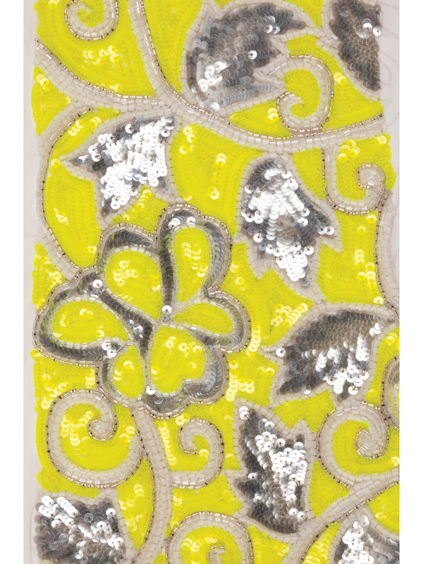 Floral patterned embroidery sample of neon yellow, silver, and platinum sequins, white and metallic silver bugle beads on white silk chiffon. Traced pattern is still visible on chiffon.