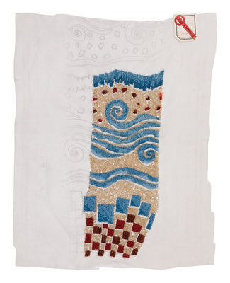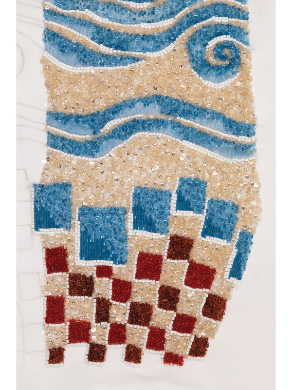 Stylized geometric patterned embroidery sample of champagne, blue, red, and silver faceted sequins, clear, white, blue, and red bugle beads on white silk chiffon. Traced pattern is still visible on chiffon.