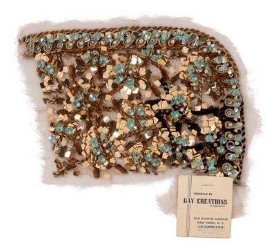 The first is a curved edge of chinelle thread embroidery with gold square sequins, rhinestones, gold braid and blue jewel sequins. Label: Originals by Gay Creations Incporporated / 519 Eigth Avenue New York, N.Y. / LO 4-3370-1-2-3
