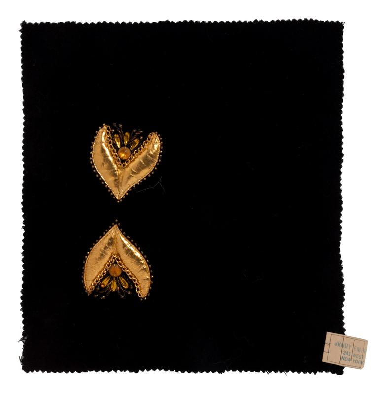 The sixth is made of padded gold flower petals surrounded by gold beads and chains with gold faceted jewels and gold braid. Label: Brody Embroidery Co. / 241 West 86th St / New York 18 NY