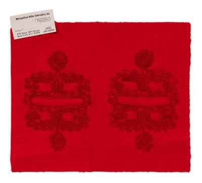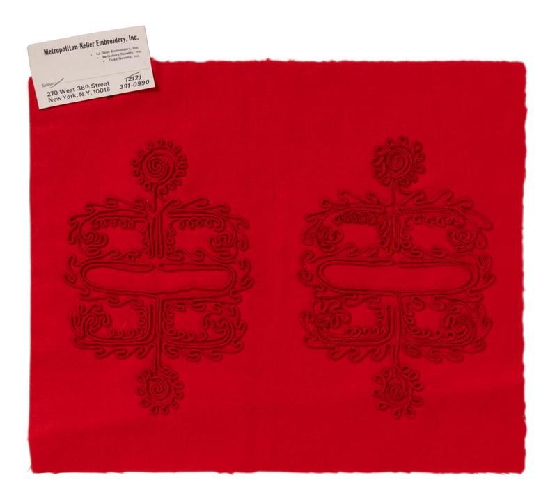 The seventh is red wool with red thread and cord embroidery. Label: Metropolitan-Keller Embroidery, Inc. / 270 West 38th Street / New York, N.Y. 10018